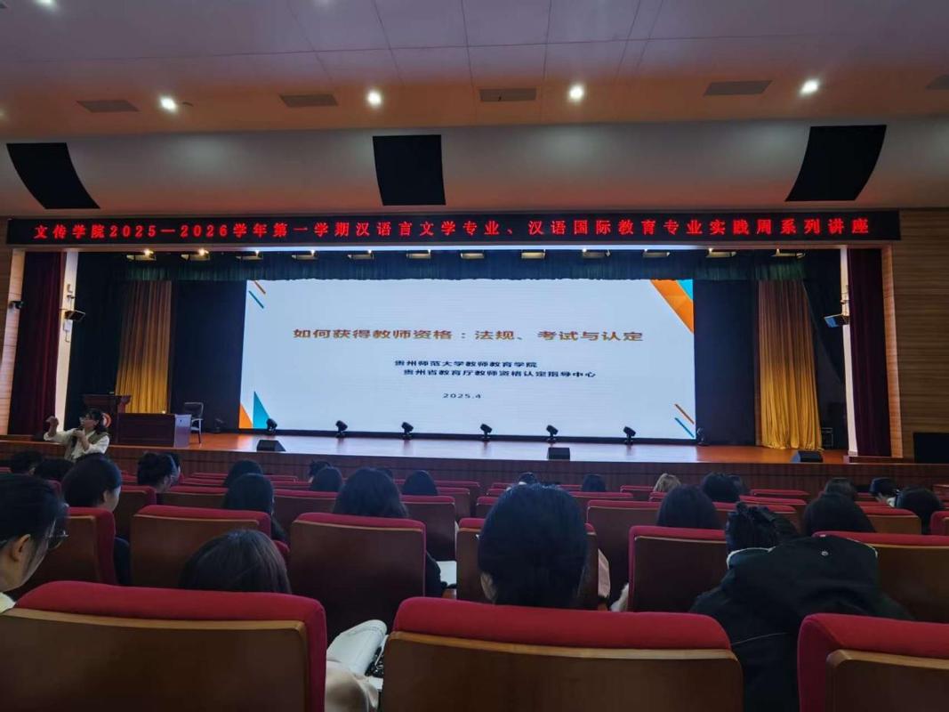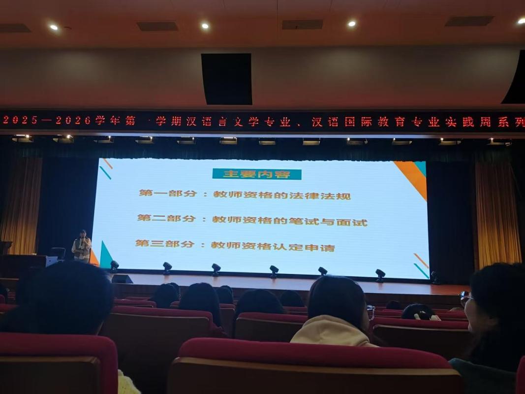2025—2026学年度第一学期汉语言文学、汉语国际教育专业实践周活动在综合楼一楼报告厅正式启幕。当日,两场聚焦教师资格与汉字语言学习的专题讲座,为同学们呈现了一场兼具实用性与学术性的知识盛宴。