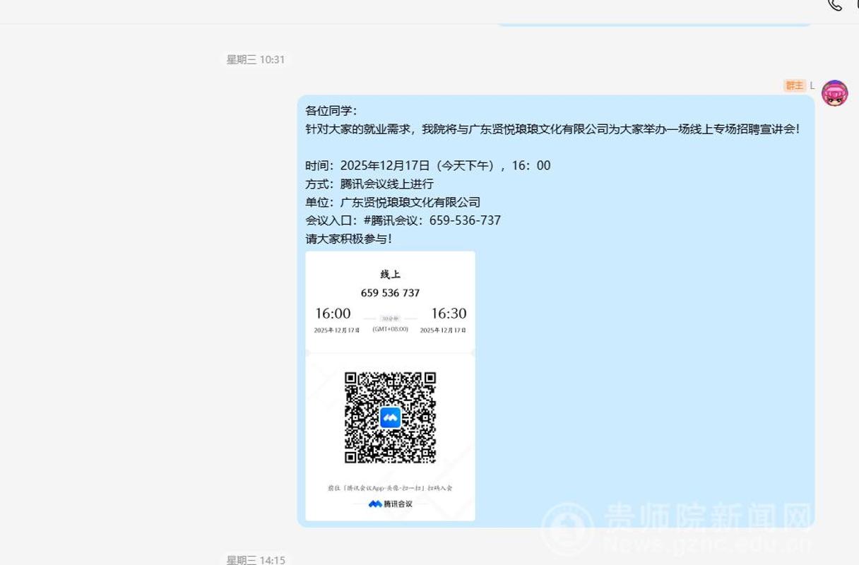 于2025年10月至12月期间,先后与贵阳市观山湖区普瑞学校、兴仁市树德学校、广东贤悦琅琅文化有限公司等3家单位合作,共同组织了5场线上线下相结合的专项招聘活动。活动涵盖企业宣讲、岗位介绍、互动问答、试讲面谈等多个环节,旨在为2025届及2026届毕业生搭建从校园实践到职场就业的有效衔接平台。